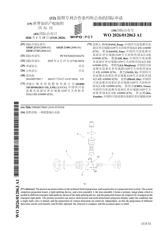 极米科技公布国际专利申请:“一种投影镜头系统”