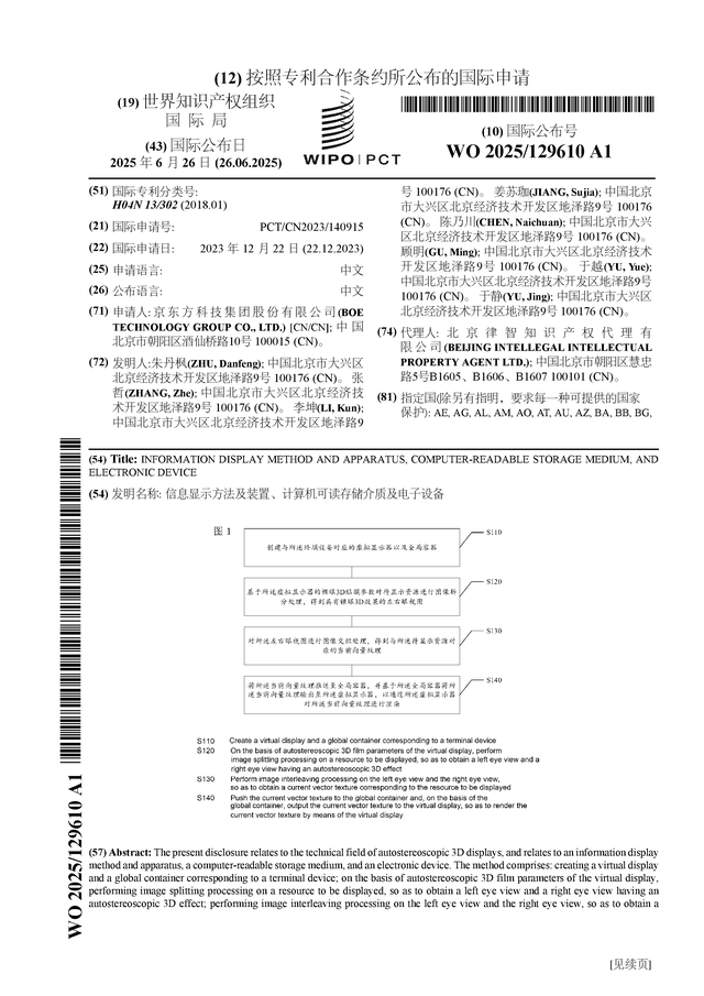 证券之星消息,根据企查查数据显示京东方A(000725)公布了一项国际专利申请,专利名为“信息显示方法及装置、计算机可读存储介质及电子设备”,专利申请号为PCT/CN2023/140915,国际公布日为2025年6月26日。