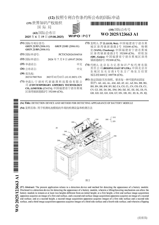 证券之星消息,根据企查查数据显示宁德时代(300750)公布了一项国际专利申请,专利名为“用于检测电池模组的外观的检测设备和检测方法”,专利申请号为PCT/CN2024/104514,国际公布日为2025年6月19日。