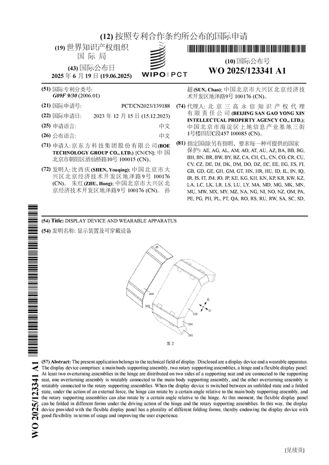 证券之星消息,根据企查查数据显示京东方A(000725)公布了一项国际专利申请,专利名为“显示装置及可穿戴设备”,专利申请号为PCT/CN2023/139188,国际公布日为2025年6月19日。