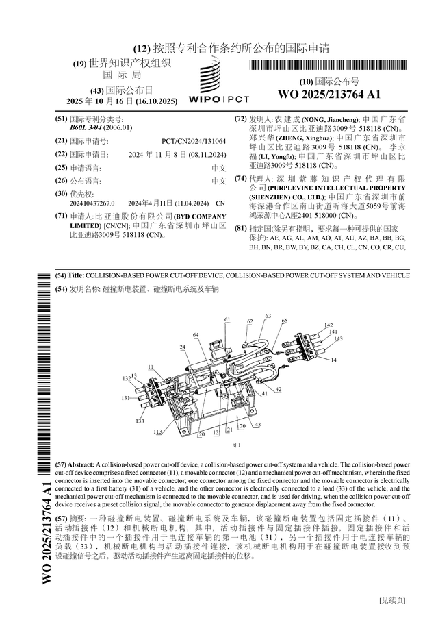 证券之星消息,根据企查查数据显示比亚迪(002594)公布了一项国际专利申请,专利名为“碰撞断电装置、碰撞断电系统及车辆”,专利申请号为PCT/CN2024/131064,国际公布日为2025年10月16日。
