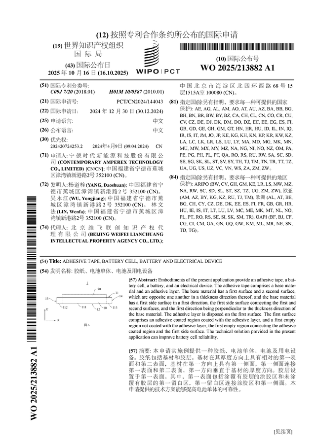 证券之星消息,根据企查查数据显示宁德时代(300750)公布了一项国际专利申请,专利名为“胶纸、电池单体、电池及用电设备”,专利申请号为PCT/CN2024/144043,国际公布日为2025年10月16日。