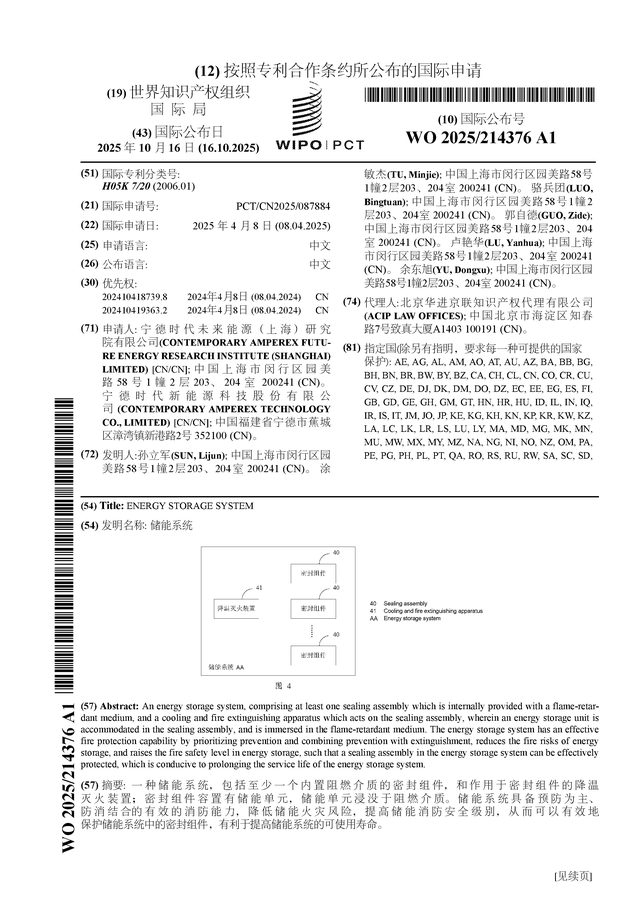 证券之星消息,根据企查查数据显示宁德时代(300750)公布了一项国际专利申请,专利名为“储能系统”,专利申请号为PCT/CN2025/087884,国际公布日为2025年10月16日。