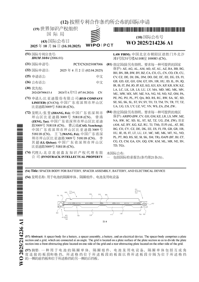 证券之星消息,根据企查查数据显示比亚迪(002594)公布了一项国际专利申请,专利名为“用于电池的隔圈单体、隔圈组件、电池及用电设备”,专利申请号为PCT/CN2025/087006,国际公布日为2025年10月16日。