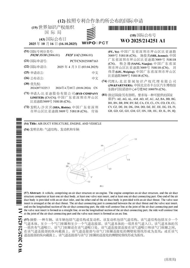 证券之星消息,根据企查查数据显示比亚迪(002594)公布了一项国际专利申请,专利名为“气道结构、发动机和车辆”,专利申请号为PCT/CN2025/087163,国际公布日为2025年10月16日。