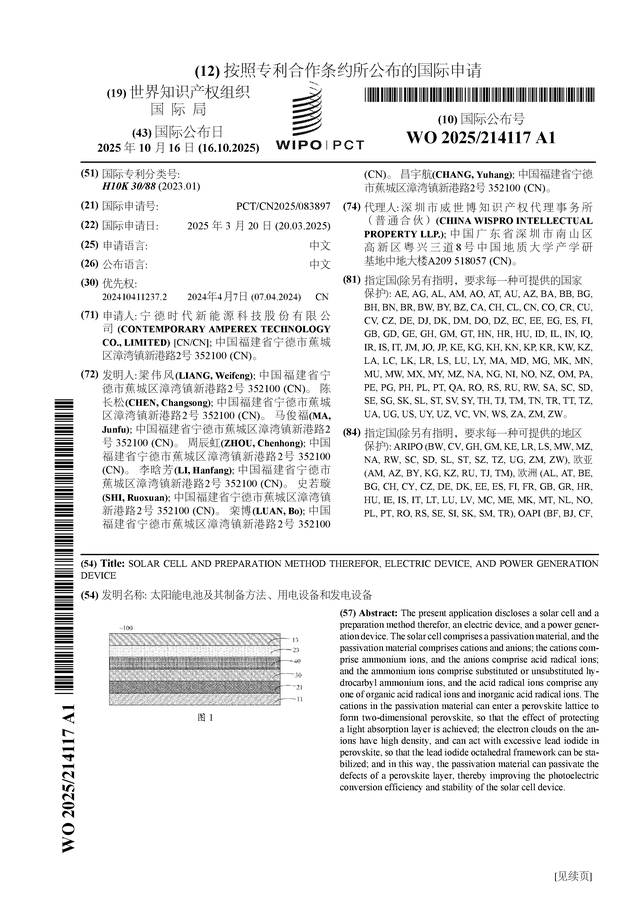 证券之星消息,根据企查查数据显示宁德时代(300750)公布了一项国际专利申请,专利名为“太阳能电池及其制备方法、用电设备和发电设备”,专利申请号为PCT/CN2025/083897,国际公布日为2025年10月16日。