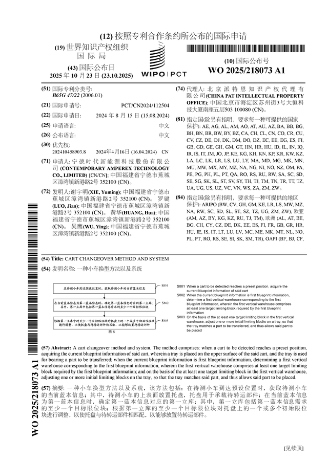 证券之星消息,根据企查查数据显示宁德时代(300750)公布了一项国际专利申请,专利名为“一种小车换型方法以及系统”,专利申请号为PCT/CN2024/112504,国际公布日为2025年10月23日。