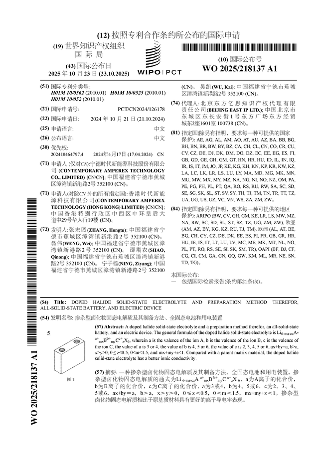 证券之星消息,根据企查查数据显示宁德时代(300750)公布了一项国际专利申请,专利名为“掺杂型卤化物固态电解质及其制备方法、全固态电池和用电装置”,专利申请号为PCT/CN2024/126178,国际公布日为2025年10月23日。