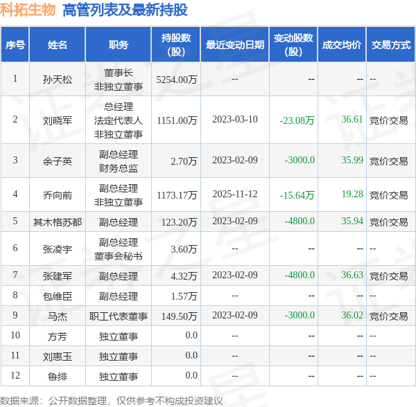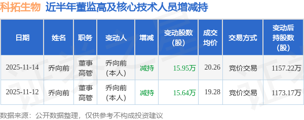 科拓生物近半年内的董监高及核心技术人员增减持详情如下: