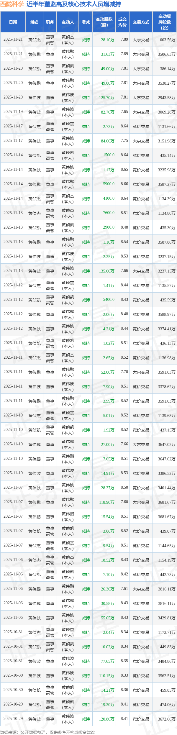 西陇科学近半年内的董监高及核心技术人员增减持详情如下: