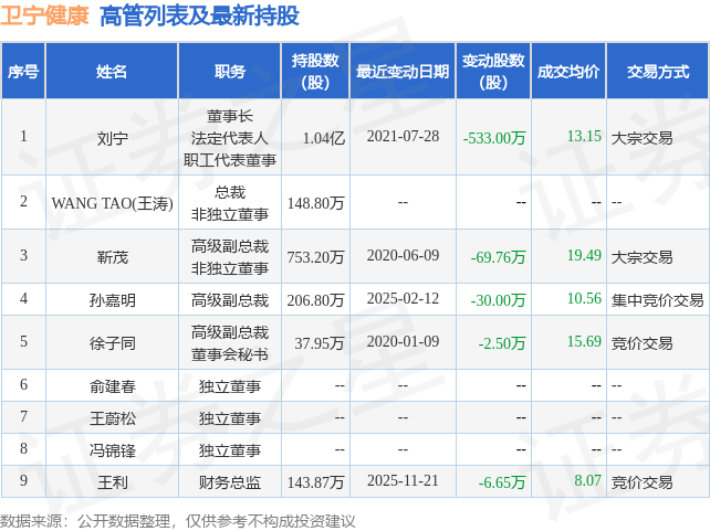 卫宁健康的高管列表及最新持股情况如下: