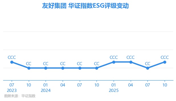 日前,华证指数公布了新一期(2025年10月31日)的ESG评级结果,友好集团(600778.SH)获得CCC评级(华证指数评级为C起至AAA九档,C为最低档,AAA为其最高一级评级/AA为其第二档),上一期(2025年7月31日)ESG评级为CC。本期ESG评级在39家多品类零售行业A股上市公司中排名第21(上一期排名第23)。