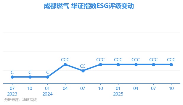 日前,华证指数公布了新一期(2025年10月31日)的ESG评级结果,成都燃气(603053.SH)获得CCC评级(华证指数评级为C起至AAA九档,C为最低档,AAA为其最高一级评级/AA为其第二档),上一期(2025年7月31日)ESG评级为CCC。本期ESG评级在22家燃气公用事业行业A股上市公司中排名第10(上一期排名第9)。