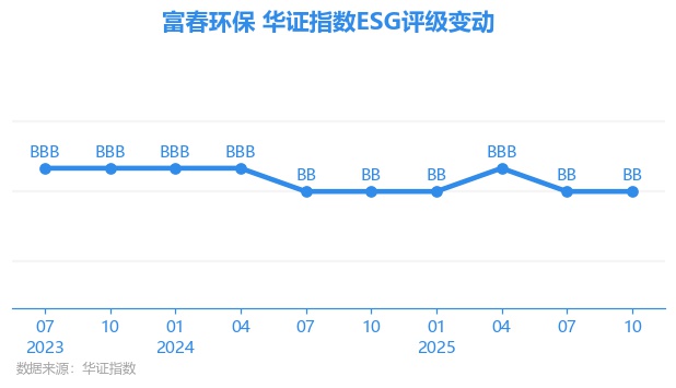 日前,华证指数公布了新一期(2025年10月31日)的ESG评级结果,富春环保(002479.SZ)获得BB评级(华证指数评级为C起至AAA九档,C为最低档,AAA为其最高一级评级/AA为其第二档),上一期(2025年7月31日)ESG评级为BB。本期ESG评级在12家复合型公用事业行业A股上市公司中排名第2(上一期排名第2)。