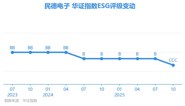 日前,华证指数公布了新一期(2025年10月31日)的ESG评级结果,民德电子(300656.SZ)获得CCC评级(华证指数评级为C起至AAA九档,C为最低档,AAA为其最高一级评级/AA为其第二档),上一期(2025年7月31日)ESG评级为B。本期ESG评级在531家电子设备、仪器和元件行业A股上市公司中排名第430(上一期排名第366)。