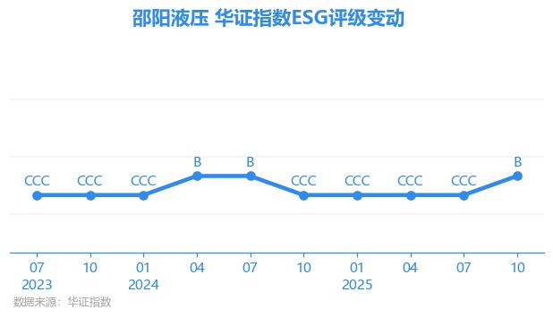 日前,华证指数公布了新一期(2025年10月31日)的ESG评级结果,邵阳液压(301079.SZ)获得B评级(华证指数评级为C起至AAA九档,C为最低档,AAA为其最高一级评级/AA为其第二档),上一期(2025年7月31日)ESG评级为CCC。本期ESG评级在492家机械制造行业A股上市公司中排名第240(上一期排名第281)。