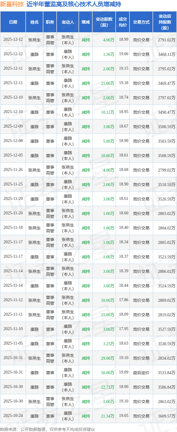 新晨科技近半年内的董监高及核心技术人员增减持详情如下: