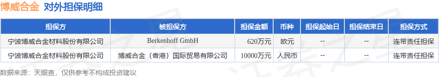 博威合金12月15日披露2笔对外担保,被担保公司2家。对外担保明细如下表: