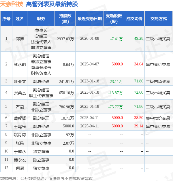 天奈科技近半年内的董监高及核心技术人员增减持详情如下: