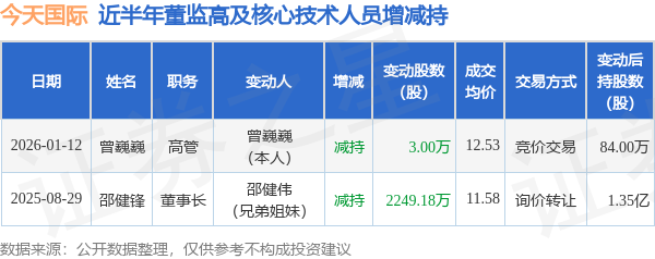 证券之星消息,根据1月13日市场公开信息、上市公司公告及交易所披露数据整理,今天国际(300532)最新董监高及相关人员股份变动情况:2026年1月12日公司高管曾巍巍共减持公司股份3.0万股,占公司总股本为0.0066%。变动期间公司股价上涨2.94%,1月12日当日收盘报12.59元。