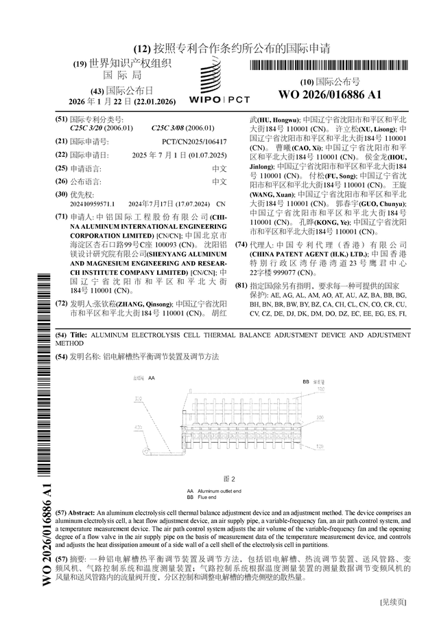 证券之星消息,根据企查查数据显示中铝国际(601068)公布了一项国际专利申请,专利名为“铝电解槽热平衡调节装置及调节方法”,专利申请号为PCT/CN2025/106417,国际公布日为2026年1月22日。